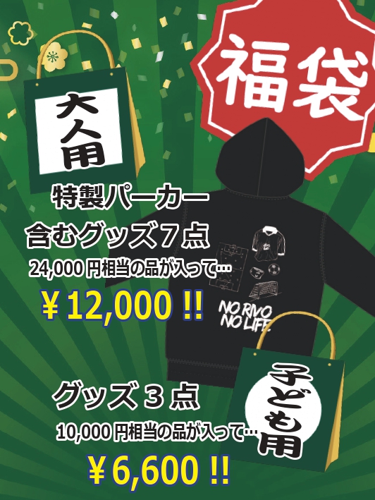「大人用」「子ども用」の2種類あり、「大人用」は限定品のオリジナルパーカーを含め、24,000円相当の品の詰め合わせで12,000円、「子ども用」は10,000円相当の品が入って6,600円と超おトク❗