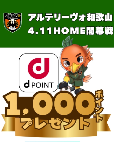 開幕戦当日、アルテリーヴォグッズ売り場で3,000円以上購入された先着30名様に、dポイント1,000円分をプレゼント❗